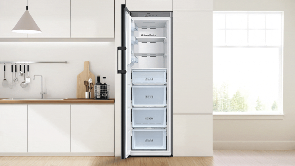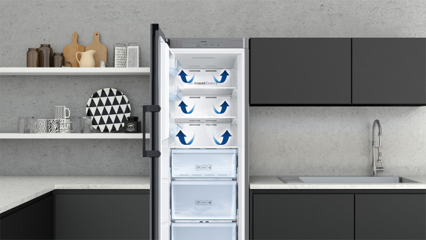 The All-Around Cooling system continually monitors any temperature fluctuation and cools evenly from corner to corner. Cold air is blown out through multiple vents on every shelf level to create a multi-directional airflow, so it maintains a constant temperature and food stays frozen.