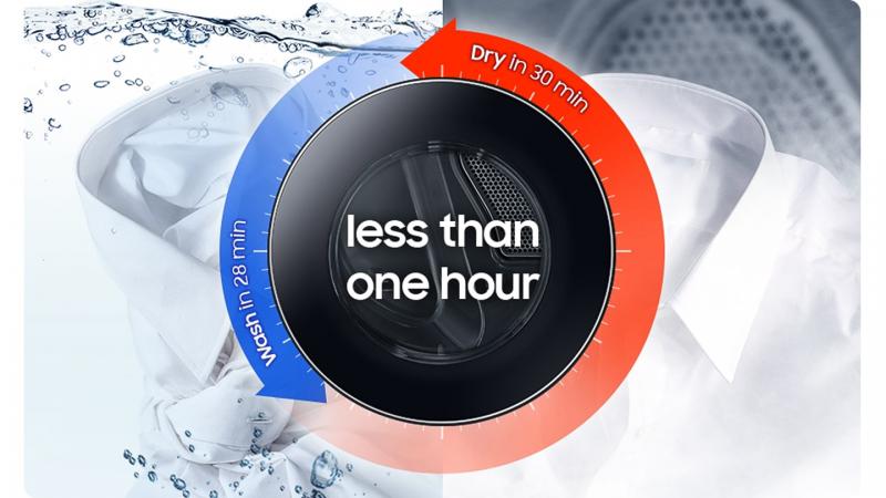 Get clothes clean and ready to wear in just 1 hour. The Super Speed course can dry a load of synthetics in 30 minutes* and continually optimizes the temperature. And with a Super Speed washing machine you can wash clothes in 28 minutes**. So garments can be washed and thoroughly dried in 1 hour.