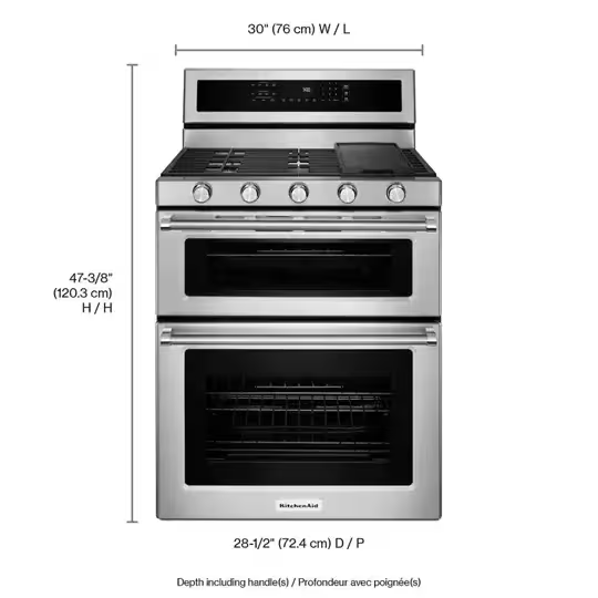 combines a bold blend of professionally-inspired styling with sleek touches for the home. This double oven range features Satin Textured Handles and the KitchenAid® Badge, a symbol of uncompromised quality.