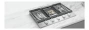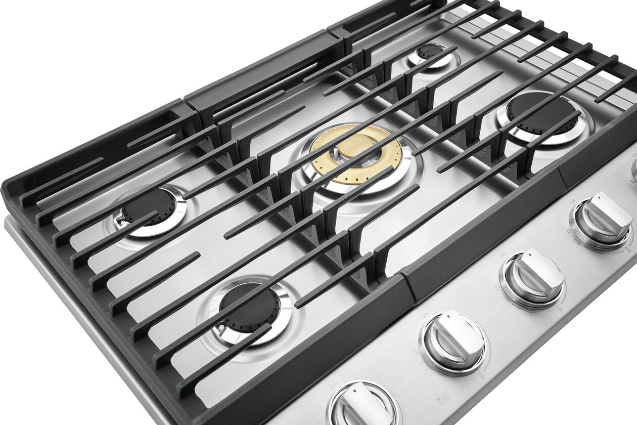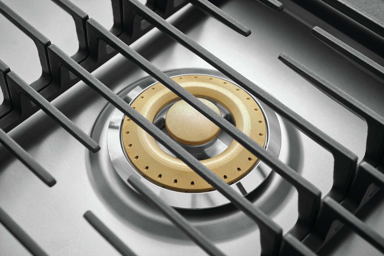 Full-framed linear grates, edge-to-edge front controls with sturdy LED backlit knobs and a premium brass burner accent lend to the sleek design that make this cooktop a focal point of your kitchen