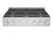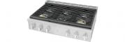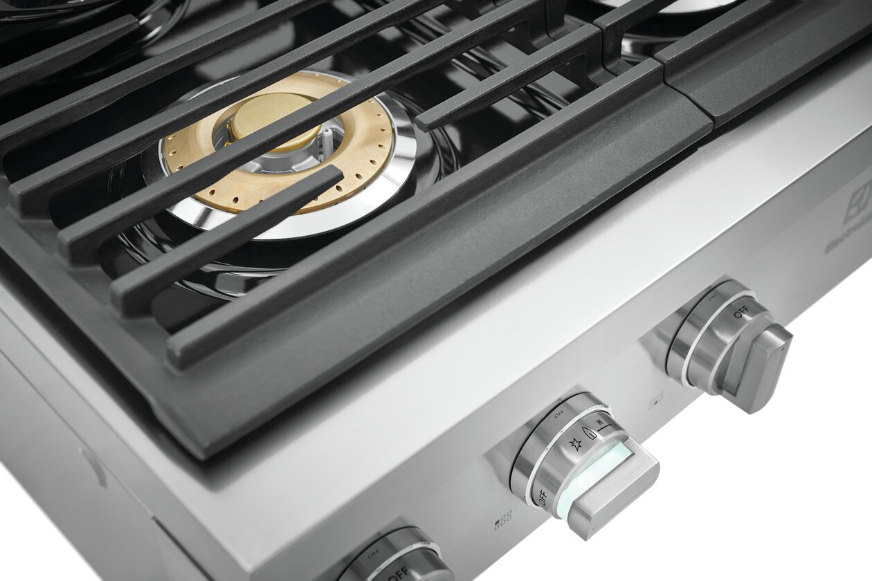 Full-framed linear grates, edge-to-edge front controls with sturdy LED backlit knobs and premium brass burner accents lend to the sleek design that make this Rangetop a focal point of your kitchen