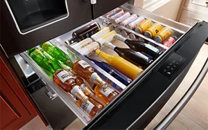 The difference is the details with KitchenAid® Multi-Door French Door Refrigerators. Signature Platinum Interior wows from the inside out with wood-look trim and metallic accents. The FreshChill™ Full-Width Refrigerated Drawer lets you customize temperature settings for the items you reach for most. And a Three-Tier Freezer Drawer conveniently organizes frozen foods so they're easy to find.