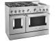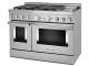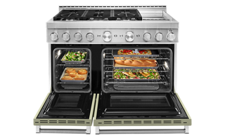 Satisfy your craving to create with a 48-inch KitchenAid® Commercial-Style Range with Even-Heat™ Chrome Electric Griddle. This 6-burner gas range features two versatile 20,000 BTU Ultra Power™ Dual-Flame Burners with the power and precision to successfully sear, simmer, stir-fry and sauté. The double oven with Even-Heat™ True Convection helps you achieve more consistent baking and roasting.