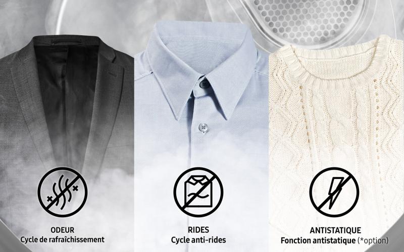 Quickly refresh and remove wrinkles from your clothes without a full wash or dry cleaning. Multi-Steam technology releases steam into the laundry to refresh and sanitize clothes. It reduces odors and static electricity, and also removes wrinkles from clothes*, so they require less ironing.
