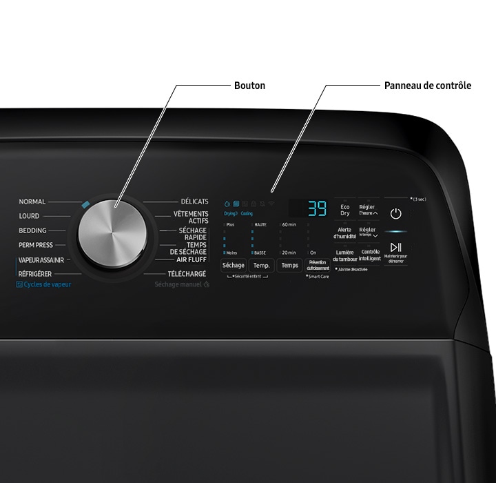| List of options | Moisture alert, Anti-crease, Smart control, Time setting (High), Time setting (Low), Child lock (double touch), Sound off (long press), Eco Dry, Smart Care (long press), Drum light, Smart Control |