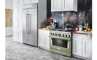 Satisfy your craving to create with a 48-inch KitchenAid® Commercial-Style Range with Even-Heat™ Chrome Electric Griddle. This dual fuel range combines an electric double oven with a 6-burner gas cooktop. Two 20,000 BTU Ultra Power™ Dual-Flame Burners offer power and precision to successfully sear, simmer, stir-fry and sauté. Even-Heat™ True Convection helps you achieve more consistent baking and roasting.