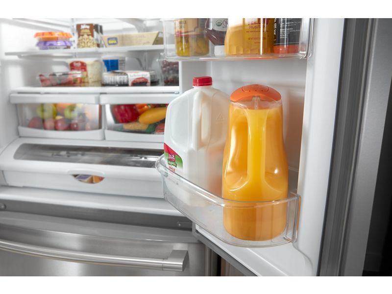 Get a performance powerhouse in the kitchen with the Maytag® French Door Bottom Mount Refrigerator. This 36 inch refrigerator has a fingerprint resistant stainless steel finish on the outside, and the Max Cool Setting on the inside, which turns the temp to the coldest level for 24 hours with the touch of a button.