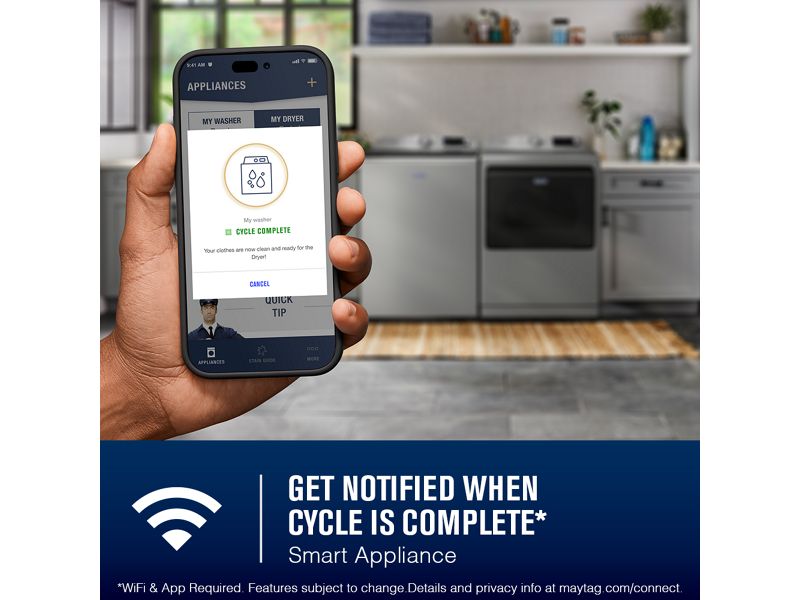 Stay on top of laundry with end of cycle notifications on your smart device to ensure finished loads aren’t left behind.*WiFi & App Required. Features subject to change. Details and privacy info at maytag.ca/connect.