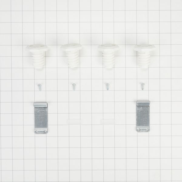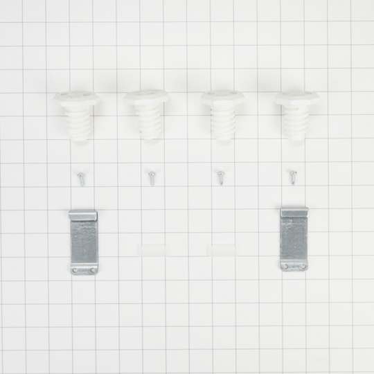 - Kit includes (2) hooked steel brackets, (4) leveling dryer feet, (2) plastic clips, and (4) screws