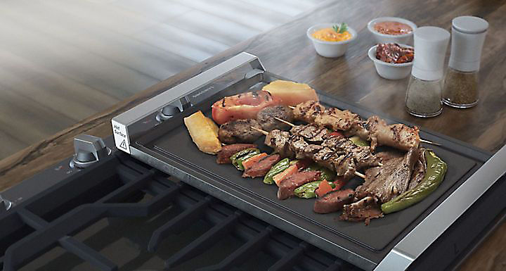 Included heavy-duty cast iron griddle with a wide surface is ideal for quickly and evenly sizzling, searing and sautéing. With stainless steel handles on both sides, it's easy to move and looks stylish.
