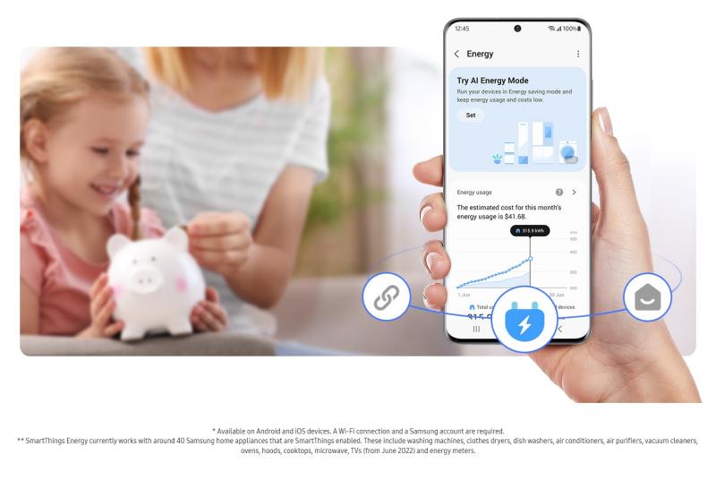 Manage your energy usage and save money. SmartThings Energy* provides energy efficiency tips, and monitors the energy consumption of appliances** in real-time, comparing it to the previous month. It also alerts you if your monthly targets are exceeded.