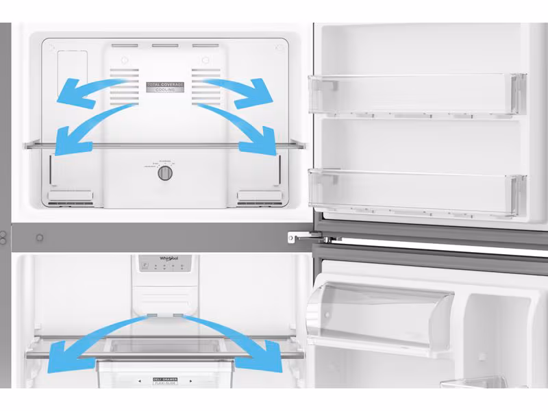 With Total Coverage Cooling, multi-flow vents direct fresh, chilled air throughout the refrigerator to help keep an even temperature at every shelf.