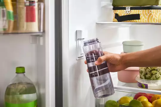Enjoy a sleek look and fresh, filtered water with the Interior Filtered Water Dispenser. The dedicated space provides enough room to rest bottles, pitchers, pots, glasses and measuring cups under the dispenser, so you can get fresh filtered water with ease.