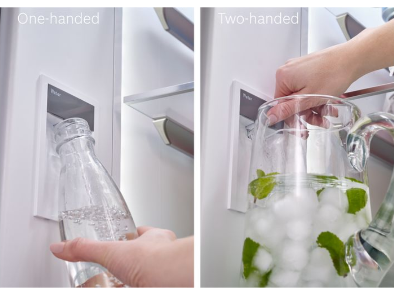 Thoughtfully tucked away is the internal water dispenser for refreshing, pure water at the touch of a button, or push of a nozzle, without disrupting the exterior design.