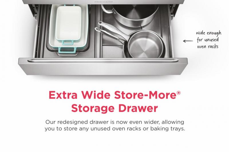 Our redesigned Store-More Storage drawer is now even wider - allowing you to store any unused oven racks, baking trays and more!