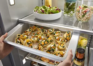 This premium 36" built-in refrigerator with exterior ice and water dispenser features PrintShield™ Finish to resist fingerprints outside, and has innovative storage inside. Like the Under-Shelf Prep Zone with included bakeware, and the moisture- and stain-resistant Wood-Look Pull Out Tray that keeps ingredients beautifully organized. Plus, optimal temperatures are maintained for your ingredients with the ExtendFresh™ Plus Temperature Management System.