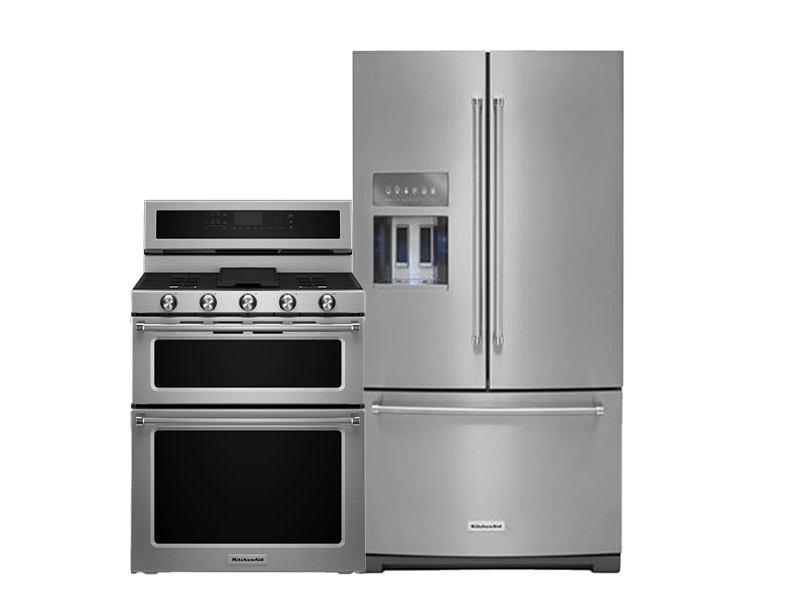 KitchenAid 5 Burner Dual Fuel Double Oven Convection Range and 26.8 Cu. Ft. Standard Depth French Door Refrigerator - KFDD500ESS-KRFF507HPS