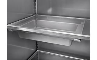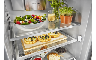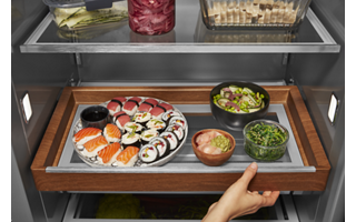 This premium 48” built-in refrigerator with exterior ice and water dispenser features a sleek stainless steel outside, and has innovative storage inside. Like the Under-Shelf Prep Zone with included bakeware, and the moisture- and stain-resistant Wood-Look Pull Out Tray that keeps ingredients beautifully organized. Plus, optimal temperatures for your ingredients are maintained with the ExtendFresh™ Plus Temperature Management System.