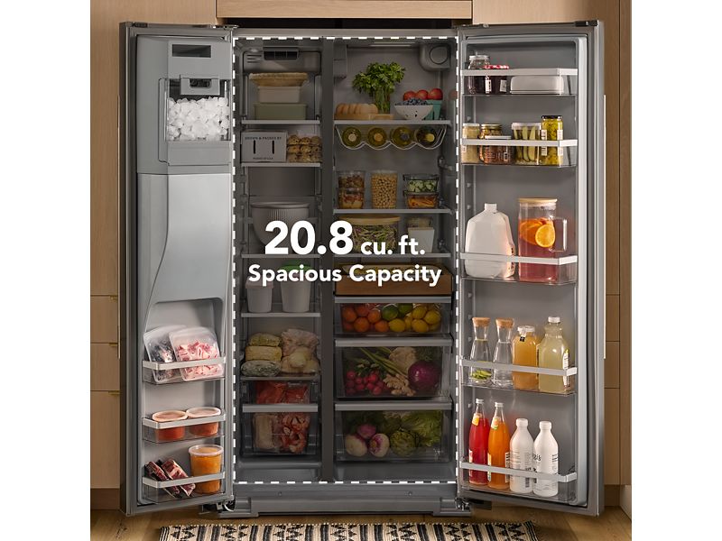 this large capacity counter-depth side-by-side refrigerator makes room for every grocery run and farmers market haul with 20.8 cu. ft. of capacity and specialized spaces for your special ingredients.
