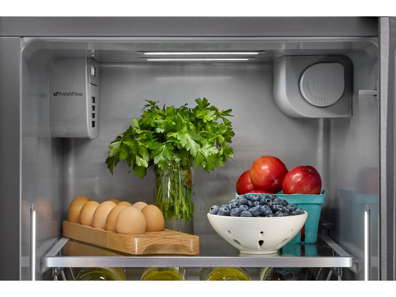 Make room for every grocery run and farmers market haul with this large capacity counter-depth side-by-side refrigerator from KitchenAid brand. Counter-depth design fits with surrounding cabinetry to create a built-in appearance. Panoramic LED Lighting illuminates every angle to keep ingredients in sight and easy to find. And an Exterior Ice and Water Dispenser with Measured Fill allows you to select and dispense the exact amount you need in ounces, cups or liters.
