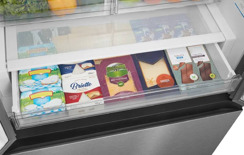 Easily store and access larger items like party trays, deli meats, and cheeses with the full-width glide-out pantry drawer. It offers smooth access and ample space, ensuring that larger groceries stay organized and within reach without disrupting other items in your fridge.