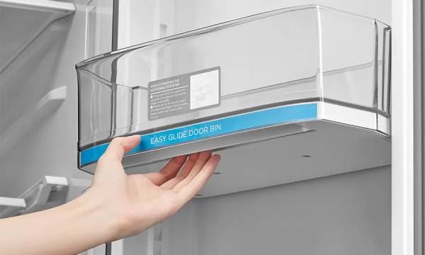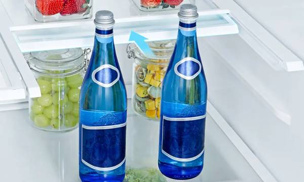 Maximize your door space by adjusting the door bins on the right to fit bottles of different sizes and heights. Whether it's tall soda bottles or smaller salad dressing bottles, effortlessly glide the door bin to achieve a perfect fit.