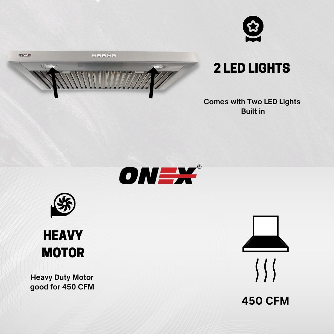 Premium quality Range Hood with 450 CFM airflow, 3 speed fan, Powerful Motor, 24-inch Ductable Range Hood will quickly ventilate your kitchen and keep the noise level as low as 52 dB to bring you an amazing cooking experience. ONEX® Range Hood comes with Two Baffle Filters. The Baffle Filters are east to pop out and can be places in the dishwasher for easy to clean. Our Baffle Filters Trap smoke and cooking grease/oil efficiently. Leaves your kitchen clean with fresh air. Easy to use Push Button Control Panel makes it extremely easy to operate for anyone. ONEX offers Heavy Duty Fan with Three Speed control for every kind of cooking. It is Suitable for different cooking methods. Comes with 2 x 2W LED Lights to make your Cooking Area Brighter.