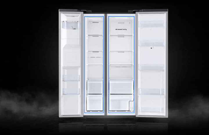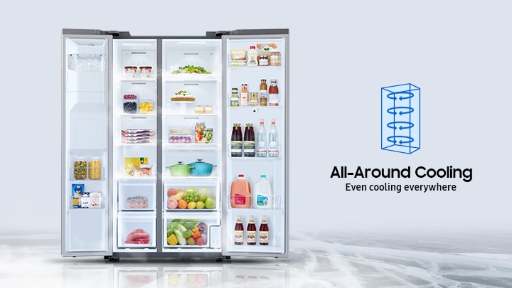 An All-Around Cooling system cools the entire fridge evenly from corner to corner. It continually checks the temperature and circulates cool air through strategically placed vents.