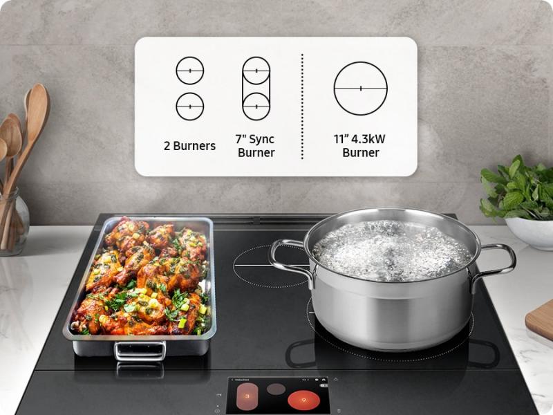 Cook a variety of dishes quickly and flexibly. The powerful heat of a 4.3kW Induction Cooktop is ideal for sautéing and searing meat, boiling water in a flash and cooking food rapidly. A 7” Sync Burner also lets you control two burners with one control, so they act as one large cooking zone.