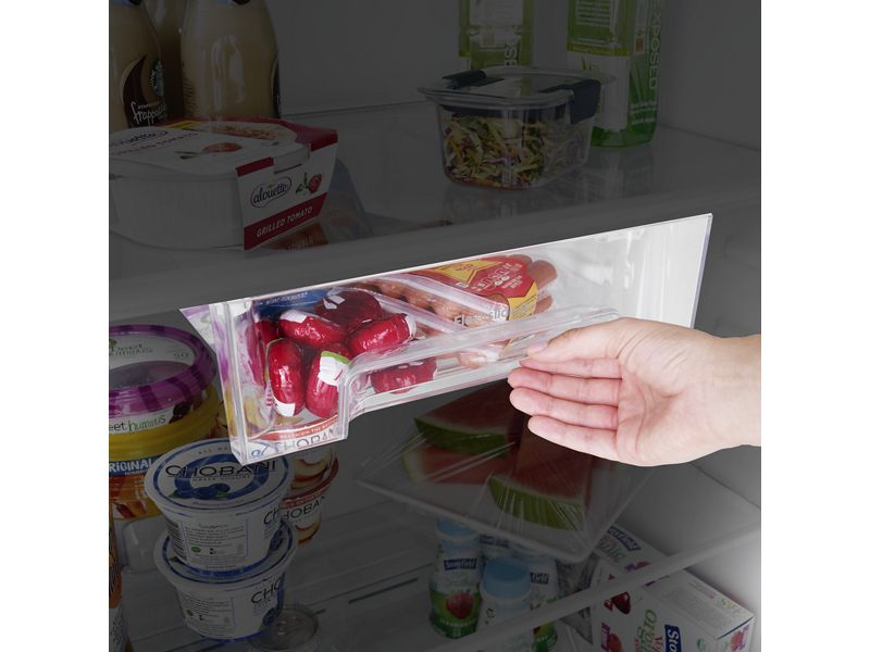 Flexi-Slide™ Deli Drawer glides sideways to open space for tall items in seconds. Slide it back for smaller essentials, letting your layout shift as your day does.