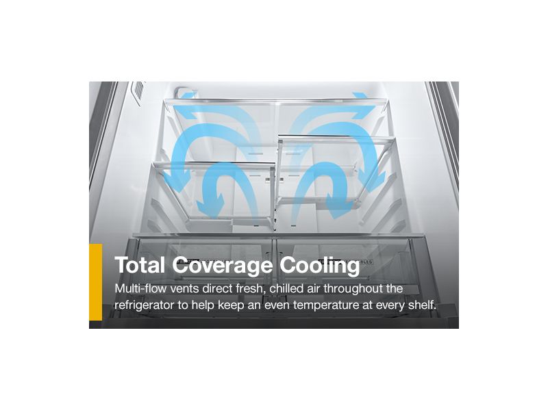 With Total Coverage Cooling, multi-flow vents direct fresh, chilled air throughout the refrigerator to help keep an even temperature at every shelf.